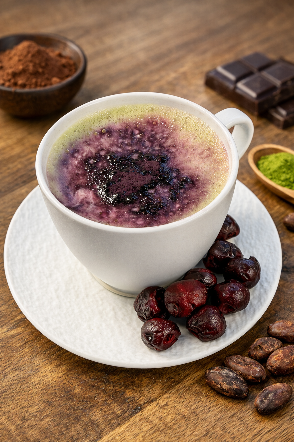 Matcha ceremonialna, spirulina pacyficzna i liofilizowana czarna porzeczka łączą się w harmonijną mieszankę o wyrazistym kolorze i wyjątkowej wartości odżywczej.