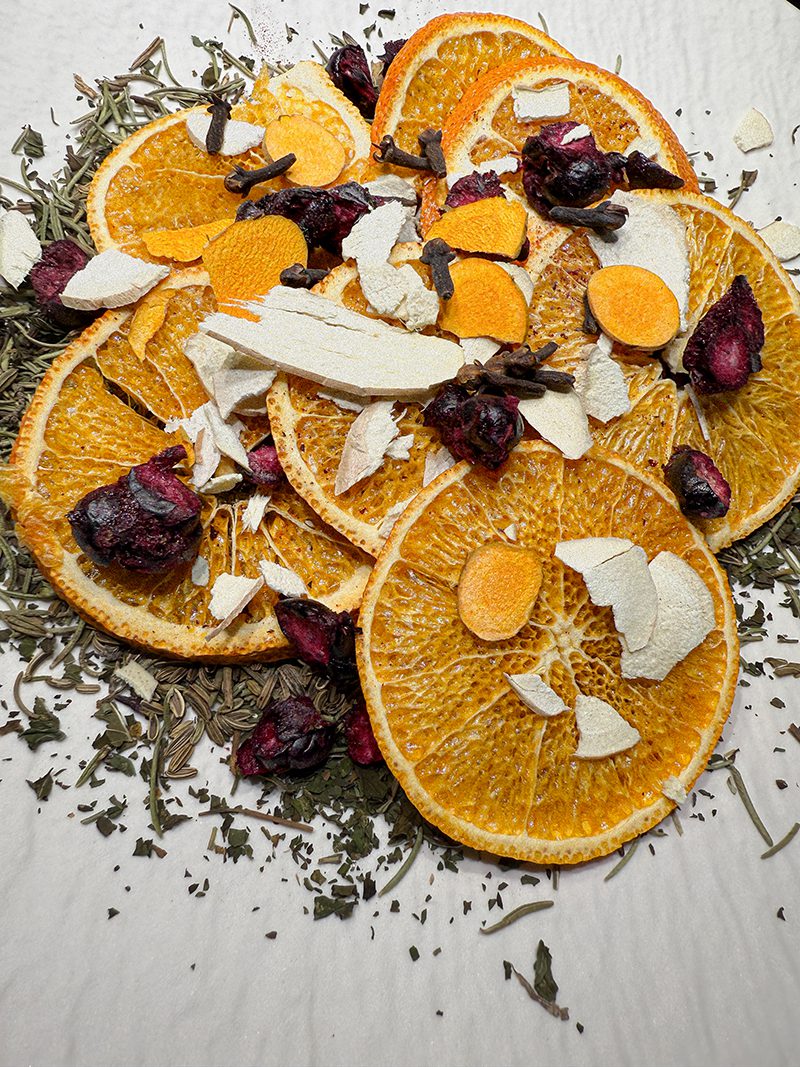 Herbata Immuno Glow to funkcjonalna kompozycja roślinna oparta na liofilizowanych owocach, przyprawach i ziołach, dobranych pod kątem wsparcia osi jelita–odporność oraz naturalnych mechanizmów ochronnych organizmu. Nie jest to herbata aromatyczna, lecz napar projektowany w oparciu o właściwości biologiczne składników roślinnych.
